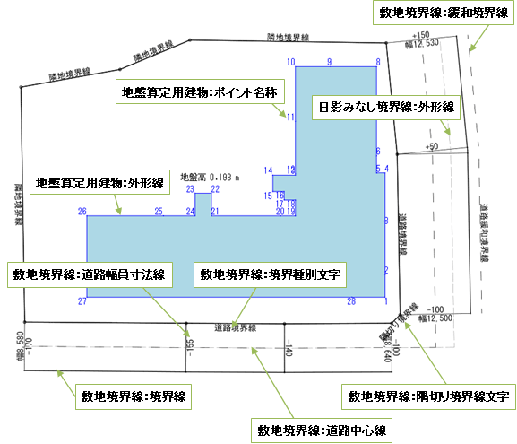 | 地盤算定用建物 | ポイント名称 | 外形線 | ||