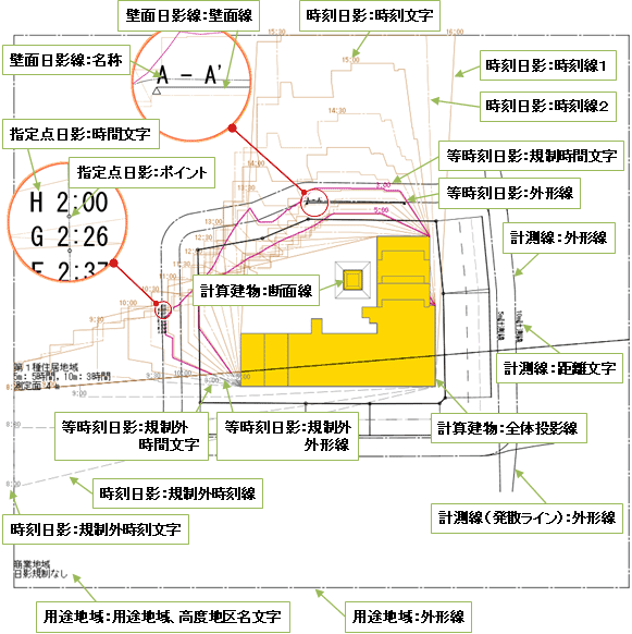 | 等時間日影 | 外形線 | 規制時間文字 | 規制外外形線 | 規制外時間文字 |
