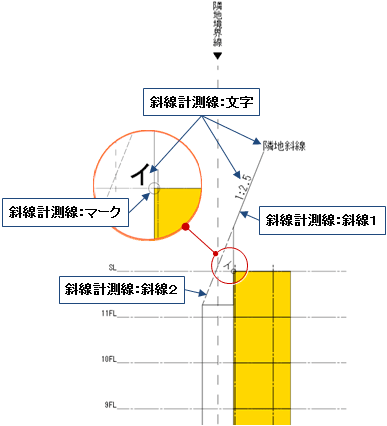 | 斜線計測線 | 斜線1 | 斜線2 | 文字 | マーク |