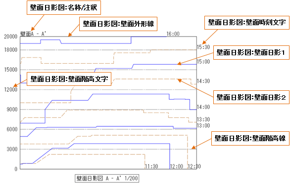 | 壁面日影図 | 壁面外形線 | 壁面日影1 | 壁面日影2 | 壁面階高線 |