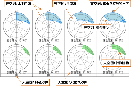 | 天空図 | 水平円線 | 目盛線 | 適合建物 | 計算建物 |