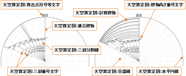 | 天空算定図 | 水平円線 | 目盛線 | 三斜分割線 | 適合建物 |