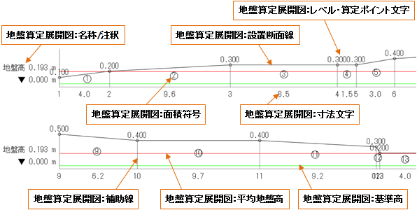 | 地盤算定展開図 | 設置断面線 | 補助線 | 平均地盤高 | 基準高 |