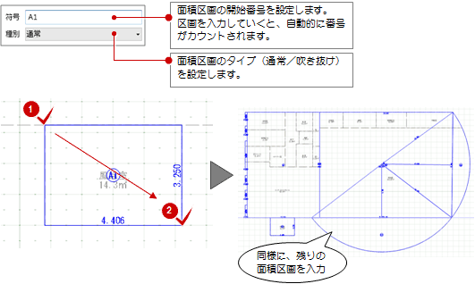 - 建築面積区画の種別には、「通常」「吹き抜け」があります。