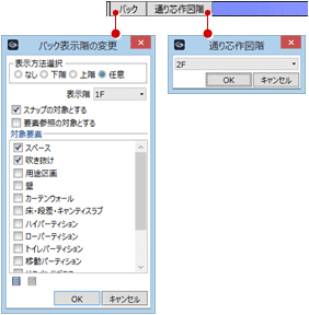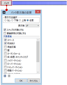 - ビューツールバーの「バック」をクリックすると、バック表示する階や要素を変更できます。