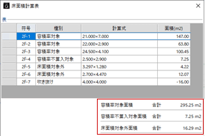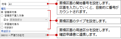 加算区画 容積率対象 容積率・床面積対象とする区画を入力します。 容積率不算入対象 床面積のみ対象とする区画を入力します。
