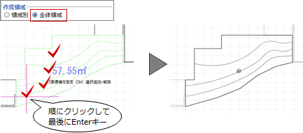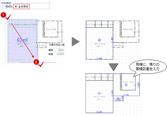 なお、区画をまとめたい場合は、「作成領域」を「全体領域」に変更し、バック図面の領域をクリックして最後にEnterキーを押すと、指定した領域をまとめて面積区画が入力されます。