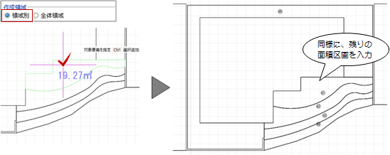 「作成領域」が「領域別」であることを確認して、バック図面の領域をクリックすると、指定した領域内に面積区画が入力されます。