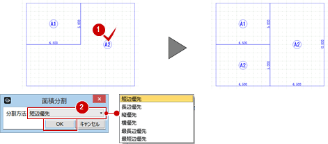 「要素参照」に変更して、分割するラインとなる既存の要素をクリックすると、その辺を参照して面積区画が分割されます。 - 面積区画を合成したい場合は