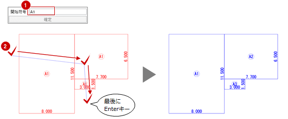 - 小さい番号を付けたい順に、区画と交差するように線分を入力し、最後にEnterキーを押します。