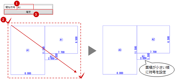 「範囲指定:領域」を使用すると、指定した領域内に含まれる区画の符号を再設定できます。このとき、区画の面積が小さい順(同じ面積の場合は登録順)に符号が付けられます。