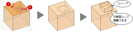 また、スイープされた既存モデルの面上に描くことで既存の面を分割できます。