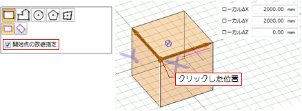 「開始点の数値指定」にチェックを付けると、3Dビューでクリックした位置からX・Y・Z方向の相対座標で開始点を指定できます。