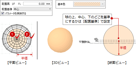「球体」を選びます。 - 「配置高」で球体を配置する高さ、「配置基準」でどこを基準にするかを設定します。