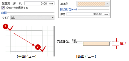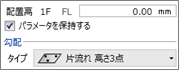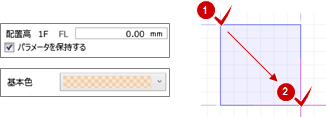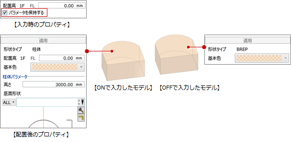 モデルを入力した後でも、プロパティから高さや配置高、底面形状を変更したい場合は、モデルの入力時に「パラメータを保持する」をONにします。