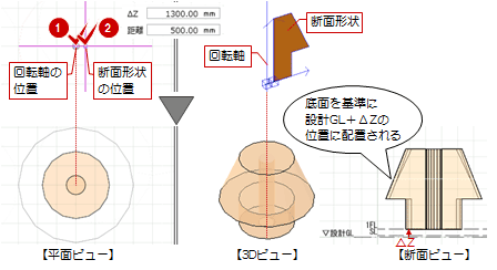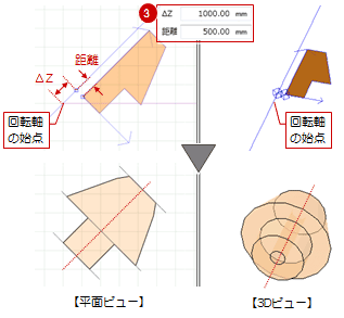 「ΔZ」は配置高さ、「距離」は回転軸からのオフセットになります。 - 回転軸の始点、終点をクリックします。