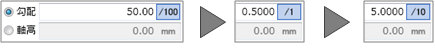 - 「勾配」は、分数部分をクリックすることで「/100」→「/1」→「/10」に切り替わります。