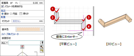 の操作については、「入力モード」を参照) - 「配置高」でスイープ体を配置する高さを設定します。