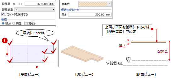の操作については、「入力モード」を参照) - 「配置高」で配置する高さ、「厚さ」で板状の厚みを設定します。