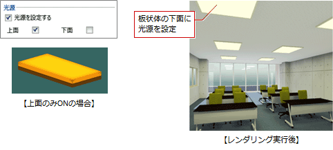 汎用オブジェクトの場合は、「光源を設定する」をONにして面を指定すると面光源を設定できます。