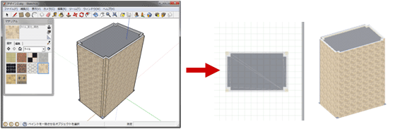 - 読み込んだデータは、SketchUpで面に設定していたマテリアル・色のまま、3Dビューに表示されます。