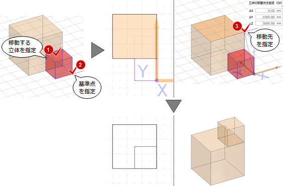 - 移動先を指定するとき、カーソル位置に入力済みのオブジェクトの面があるときはその面を参照します。このとき、Shiftキーを押していると移動先の面が固定されます。