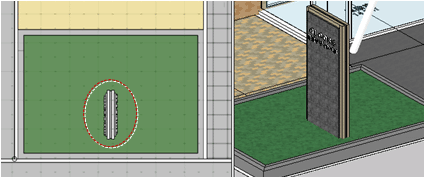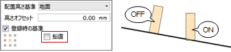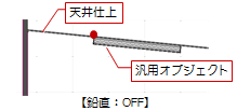 「配置高さ基準」が「地面」「部屋床面」「部品面」「天井面」「屋根面」の場合、「鉛直」がOFFの状態で汎用オブジェクトを配置すると、基準の勾配に合わせてオブジェクトが傾斜します。