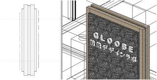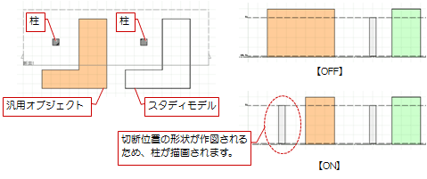 「立面を開く」において、断面線・立面線の位置でカットした汎用オブジェクトの形状を描画して、汎用オブジェクトと躯体との正確な干渉などを確認したいときは、作図表現(3Dビュー他)の「切断線上の部品類をカットする」をONにします。OFFの場合は、見付方向を含んで汎用オブジェクトの断面を描画します。