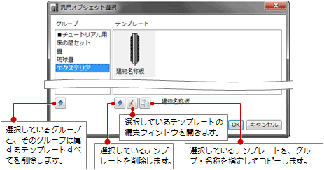 - 「汎用オブジェクト選択」ダイアログでは、テンプレートの削除、編集、コピーが行えます。