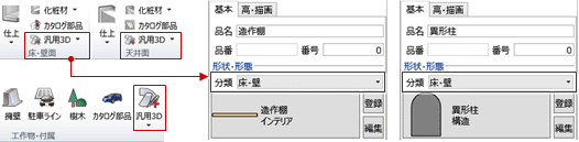 汎用オブジェクトのコマンドは、「建物設計」タブの「床・壁面」グループと「天井面」グループ、「敷地・外構」タブの「工作物・付属」グループにあります。操作は同じですが、次のような違いがあります。