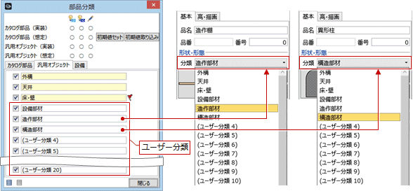 | 部品面 | カタログ部品の面、汎用オブジェクトの面、スペースの床高、床仕上、スラブ、設備基礎、階段 |