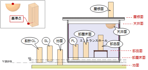 | 部屋床面 | スペースの床高、床仕上、スラブ、階段 |