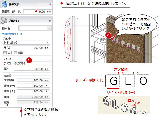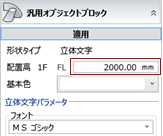 - 立体文字の配置高を数値で調整するには、立体文字の配置後にプロパティの「配置高」を変更してください。