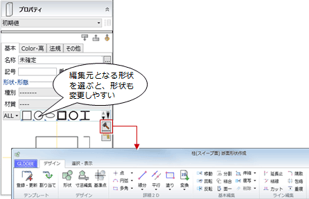 「登録・更新」でテンプレートに登録しておくと、プロパティ「基本」タブの「形状・形態」に表示されます。