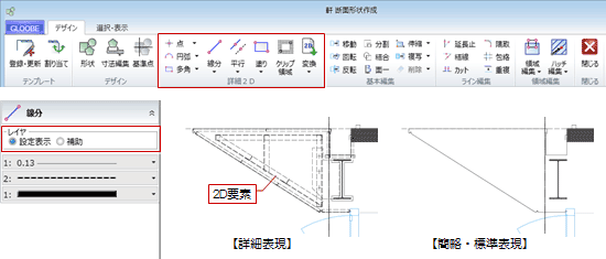 - オブジェクトの断面をより詳細に表現したい場合は、「詳細2D」のコマンドを使用して、レイヤが「設定表示」の状態で線分などを追加します。入力した2D要素は、作図表現(他一般)の「断面形状 詳細2D」の「作図する」がONのときに詳細表現で描画されます。