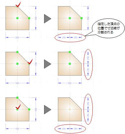 部材の寸法線が表示されます。- 幅を示す寸法を分割する場合は、図形に表示されている頂点または基準点をクリックします。