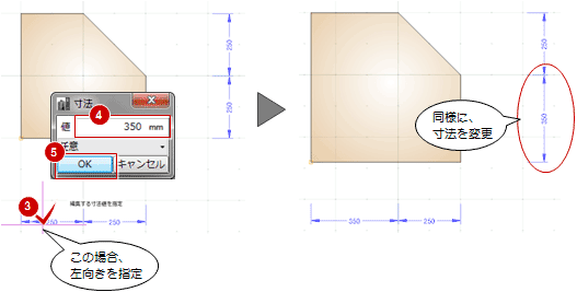 - 変更したい寸法の矢印(ここでは左向きの矢印)をクリックし、「長さ」に「350」と入力して、「OK」をクリックします。