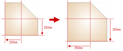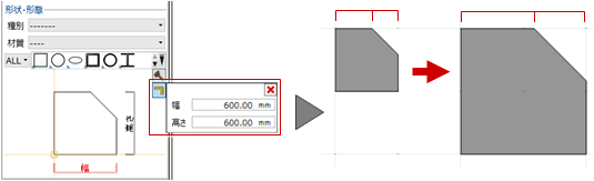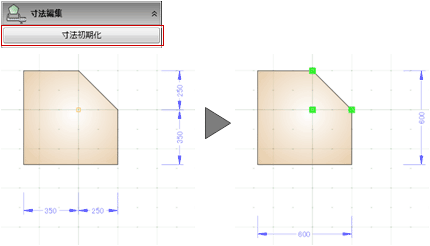 「寸法設定」で寸法を変更できますが、形状の頂点間の距離は、比率で調整されます。
