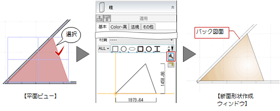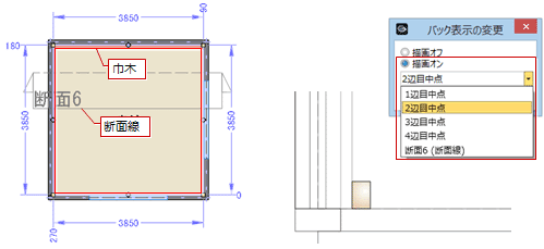 「バック表示」をクリックすると、周囲の部材がバック図面として表示され、参照しながら断面形状を変更することができます。