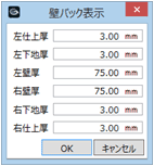 次図のように、巾木が1つのデータで4面に配置されていて、断面線が存在する場合、5つの断面が存在します。このように断面の選択肢が1つ以上あると、「バック表示の変更」ダイアログが開きます。「描画オン」をONにして、バック表示する箇所を変更します。