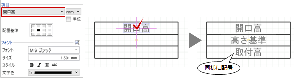 (詳しくは、「フォント/文字の設定」を参照) - 項目の配置位置をクリックします。