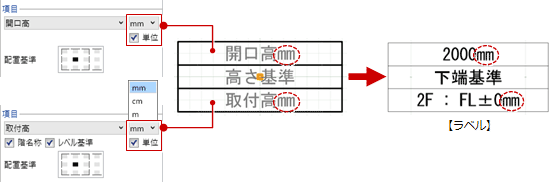 - 高さ、幅、長さ、面積などのプロパティ項目を選んだときは、単位と単位表示を設定できます。