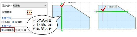 - 次図のようにマウスの位置で縦方向、横方向を任意に指定したいときは、「縦横任意」をONにします。