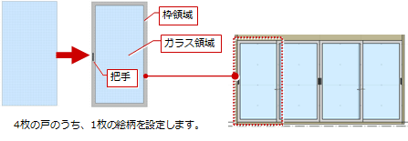 「建具区画」で設定した建具区画ごとに枠やガラス、パネル領域を作成して、引き違いなどの絵柄を作成します。