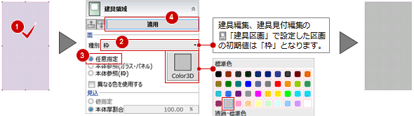指定した線分で建具領域を分割します。 - 内側と外側で異なる色にする場合は、「異なる色を使用する」をONにして、「内面」と「外面」のColor3Dを設定します。なお、「種別」が「ガラリ」のときは、内外で異なる色に設定できません。