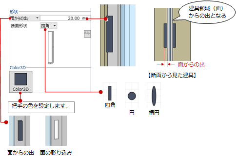 「把手」を選びます。 - プロパティで、断面形状などを設定します。