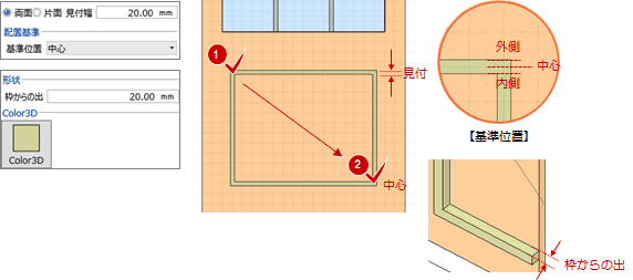 - 「見付幅」でモールの見付幅、「基準位置」でモールの配置基準を設定します。