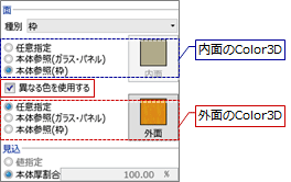- 内側と外側で異なる色にする場合は、「異なる色を使用する」をONにして、「内面」と「外面」のColor3Dを設定します。なお、「種別」が「ガラリ」のときは、内外で異なる色に設定できません。