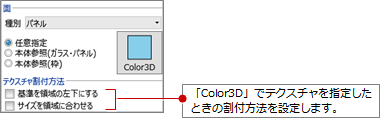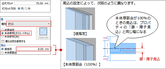 任意指定 「Color3D」を任意の色やテクスチャに設定します。 本体参照(ガラス・パネル) ガラスやパネルの色を、プロパティの「Color3D(ガラス・パネル)」と同じにします。 本体参照(枠) 枠の色を、プロパティの「Color3D(枠)」と同じにします。 - 「見込」で「値指定」にチェックを入れて、ガラスの厚みを「8.0」とします。
