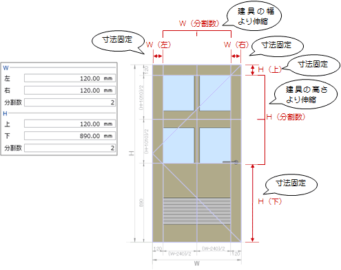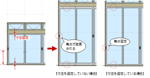 建具の幅・高さを変更したときに枠見付の寸法、把手の位置が変更されないように、指定箇所の寸法を固定します。